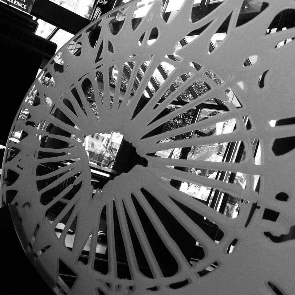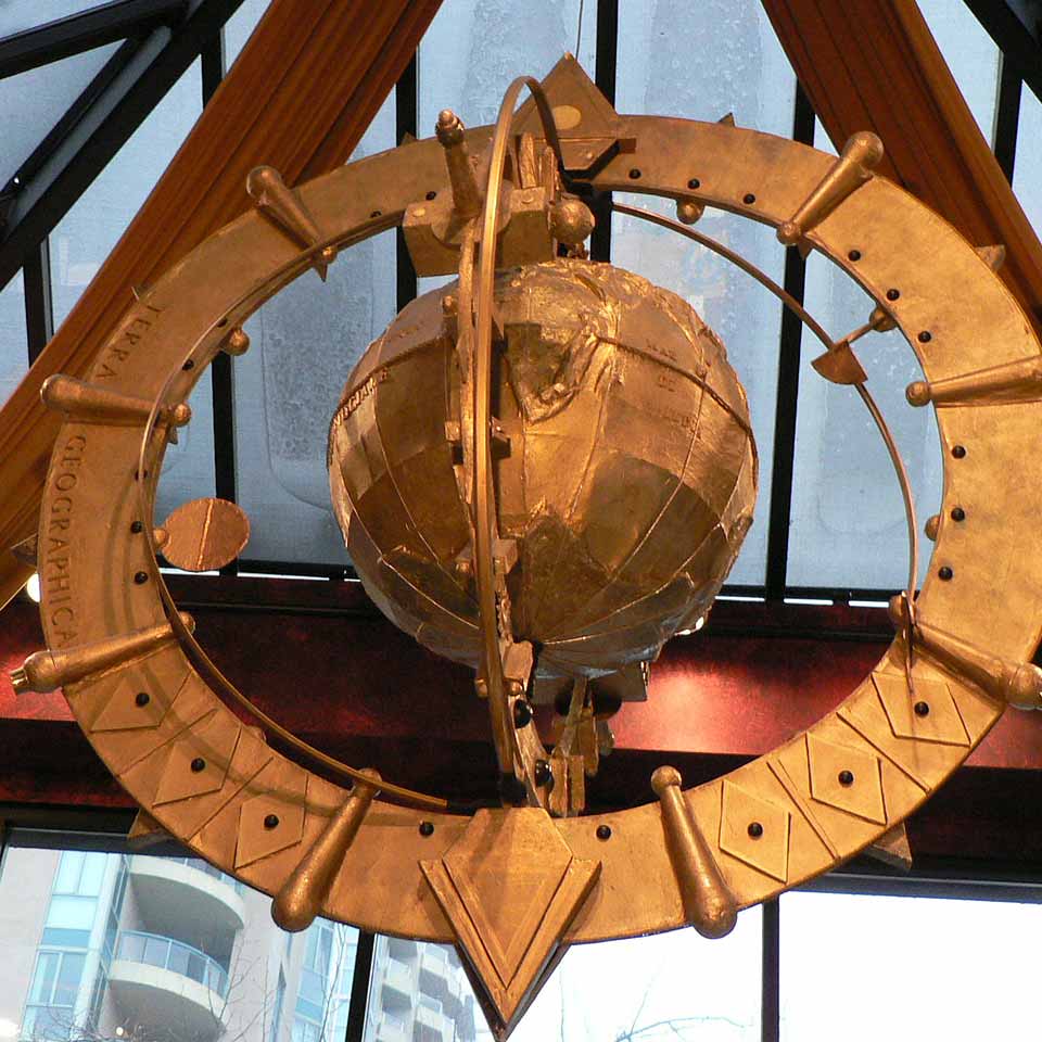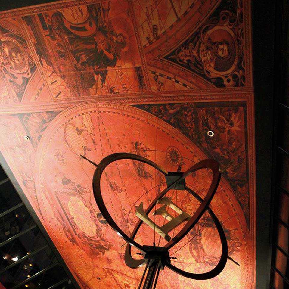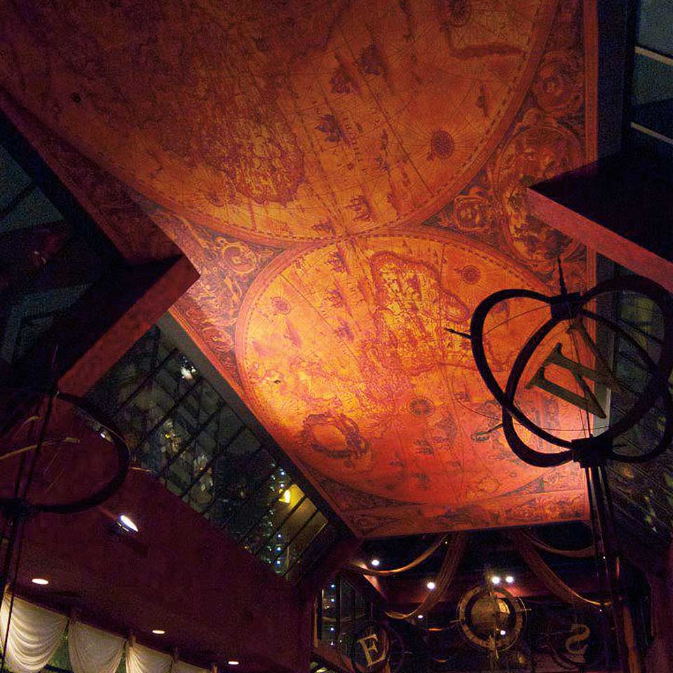 This theme was trumpeted by the spectacular 65' x 14' ceiling mural which dominates the space. In addition to the ceiling, I designed and fabricated numerous sculptural elements borrowing shapes and objects found within the ceiling mural. These included 4 Mahogany 'Compass Rose' sculptures reaching 10' high along with the grand 6 foot diameter suspended 'Orbis Terrarum' globe within the vaulted 24' atrium area.